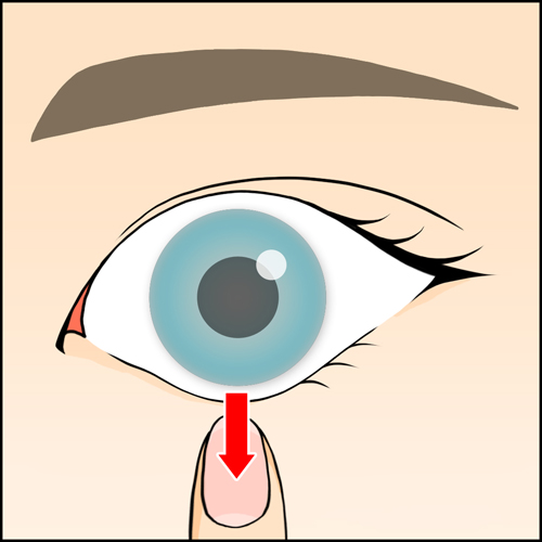 ①鏡をよく見て、レンズの位置を確認してから、利き手の中指で下まぶたを軽く引き下げます。