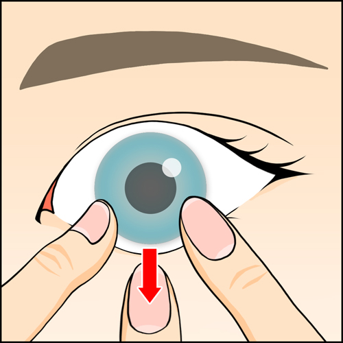 ④両目でまっすぐ前を見たまま、レンズを黒目の上に静かにのせます。レンズがきちんと黒目の上にのっている事を確認し、ゆっくりと指をはなします。